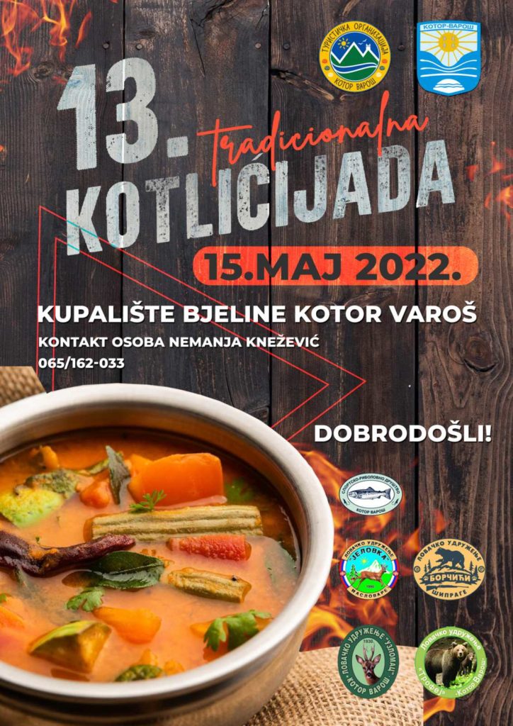 KOTOR VAROŠ, 15. MAJA – Tradicionalna “Kotorvaroška kotlićijada” biće održana danas i okupiće u takmičarskom dijelu veliki broj ekipa iz zemalja regiona, a posjetioci će moći da degustiraju lovačke i ribolovačke kotliće.