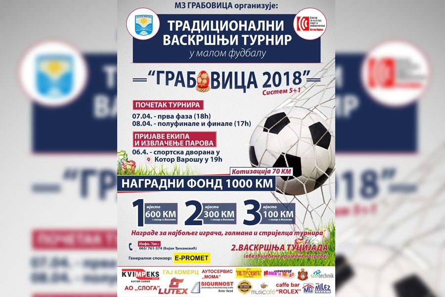 GRABOVICA, 22. marta – Mjesna zajednica Grabovica organizuje tradicionalni Vaskršnji turnir u malom fudbalu „Grabovica 2018“. Ekipe su mogu prijaviti do 6. aprila do 19 časova za kada je predviđeno izvlačenje parova turnira u sportskoj dvorani u Kotor Varošu.