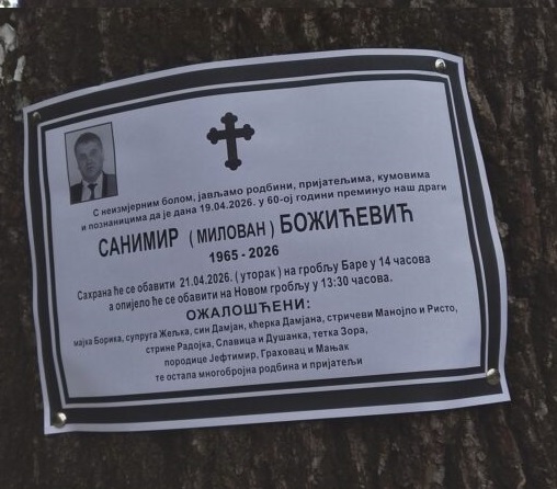 Sahrana Sanimira Božićevića biće obavljena u sutra, 21. aprila, u 14 časova na groblju Bare, dok će opijelo početi u 13.30 časova na Novom groblju.