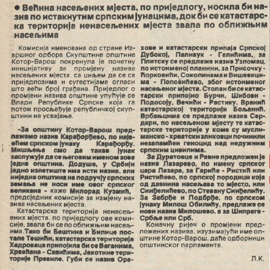 KOTOR VAROŠ, 14. aprila – Komisija za izmjenu naziva naseljenih mjesta SO Kotor Varoš pripremila je polovinom 1994. godine predložila je lokalnom palamentu inicijativu za promjenu naziva opštine.