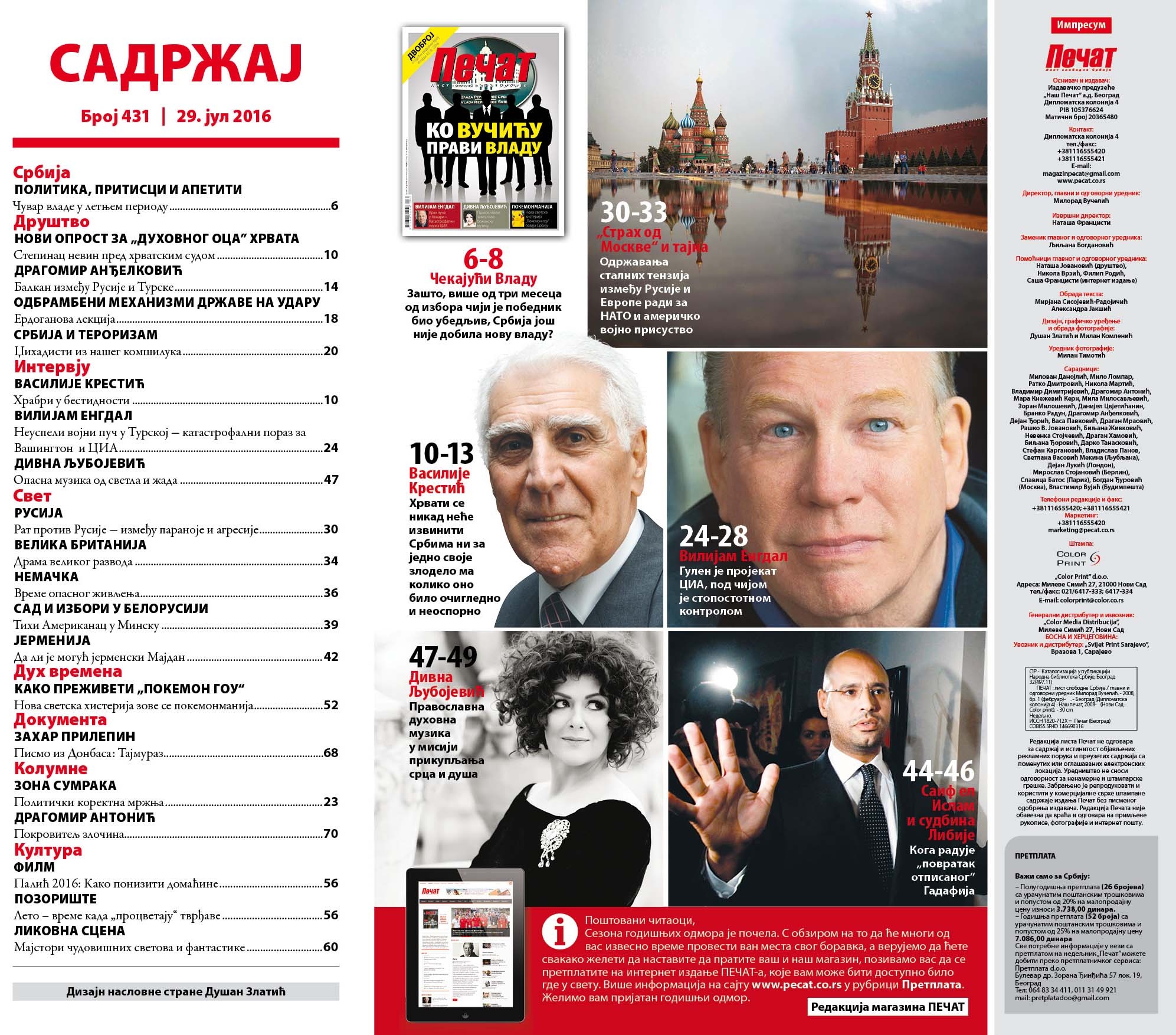 Na kioscima je novi broj ”Pečata” 0 Podeli na Fejsbuku Tvitni na twitteru tweet KOTOR VAROŠ, 29. jula – Na kioscima je novi broj ”Pečata”, lista slobodne Srbije. Obilje zanimljivih sadržaja iz Srbije, regiona i svijeta. Za ”Pečat” pišu ljudi, koji su ponos srpskog novinarstva.